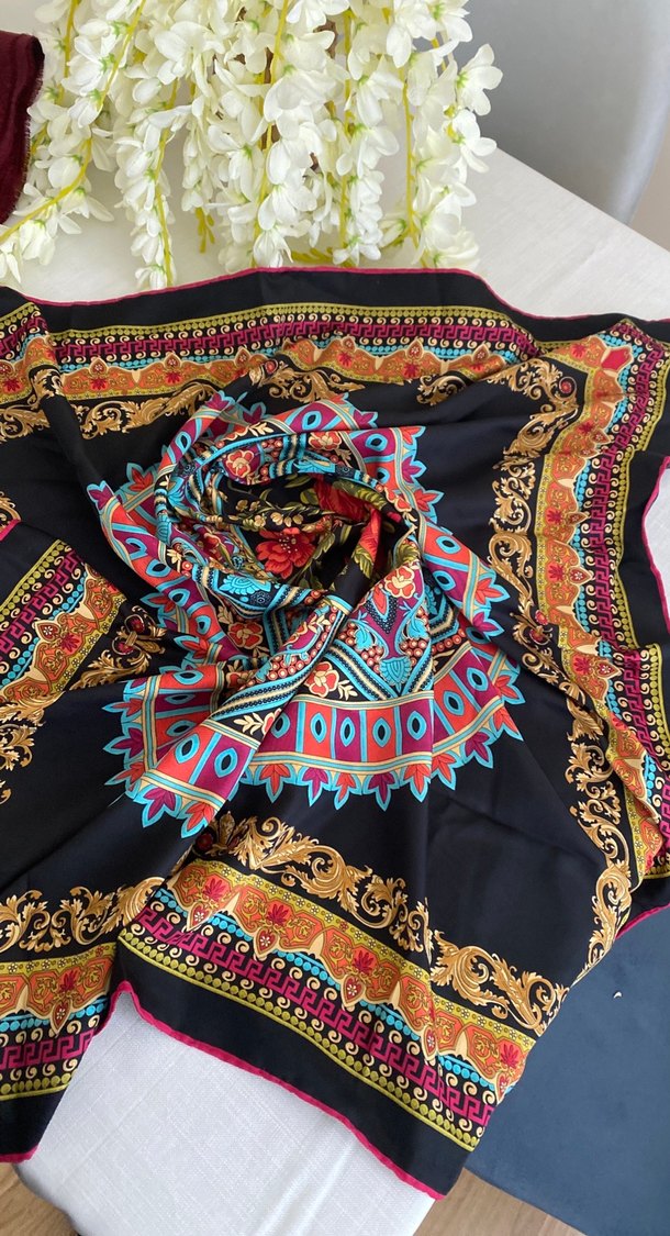Renkli, ipek görünümlü dokusuyla bohem desenlere sahip, drapeli kadın fular. Retro ve hippie tarzına uygun şık bir aksesuar.