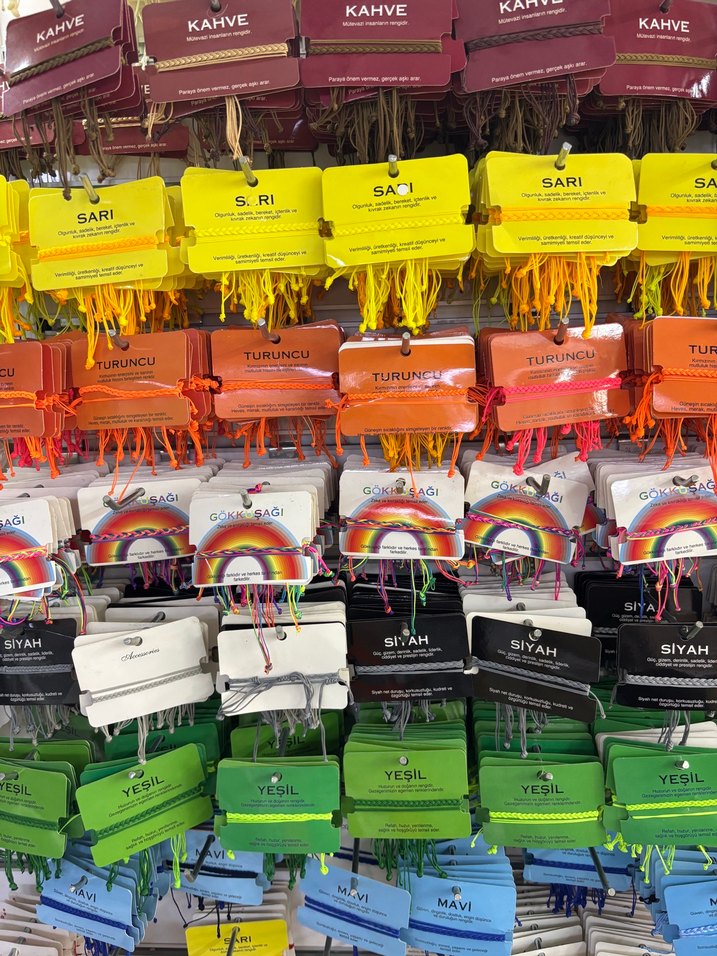 Sarı, turuncu, yeşil, mavi, kahverengi ve siyah renklerde ayarlanabilir ipli bileklikler. Günlük kullanıma uygun sade tasarım.