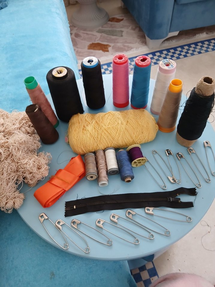 Çeşitli renklerde iplikler, yün, emniyet iğneleri, fermuarlar ve kurdelelerden oluşan dikiş ve el işi seti.