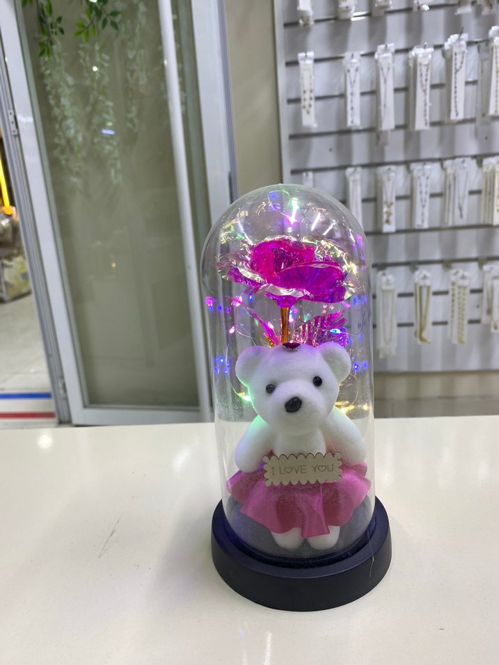 Pembe etekli küçük beyaz ayıcık ve "Seni Seviyorum" yazılı tabela, ışıklı güllerle cam fanus içinde yer alır.