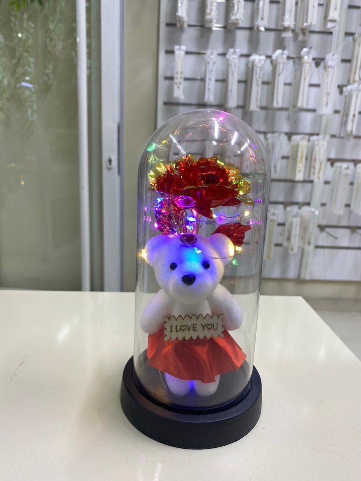 Renkli Işıklı Ayıcık ve Gül Dekorasyonulu cam fanus büyük boy