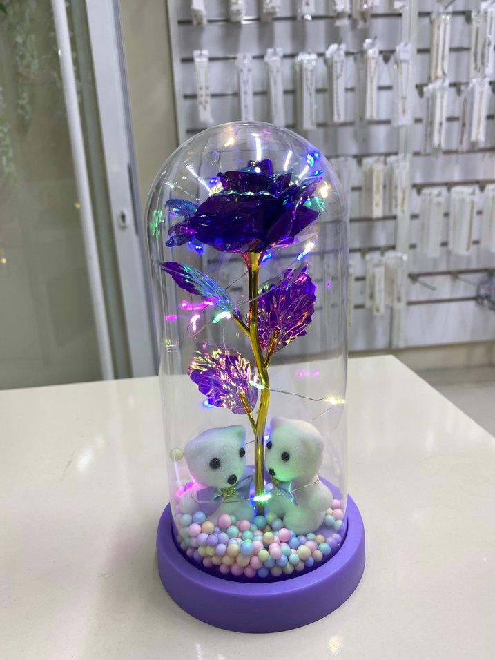 Mor renkli gül, renkli ışıklar ve küçük beyaz ayıcıkların bulunduğu dekoratif cam fanus, renkli boncuklar üzerinde yer alır.