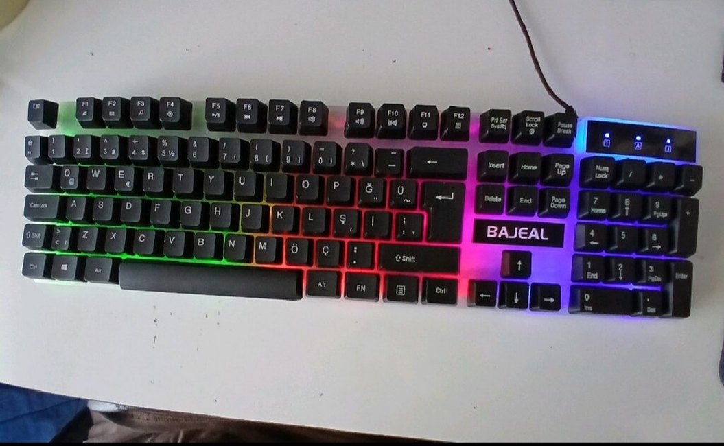 BAJ markalı, çok renkli ışıklı standart klavye. Fonksiyon tuşları ve sayısal tuş takımı bulunur.