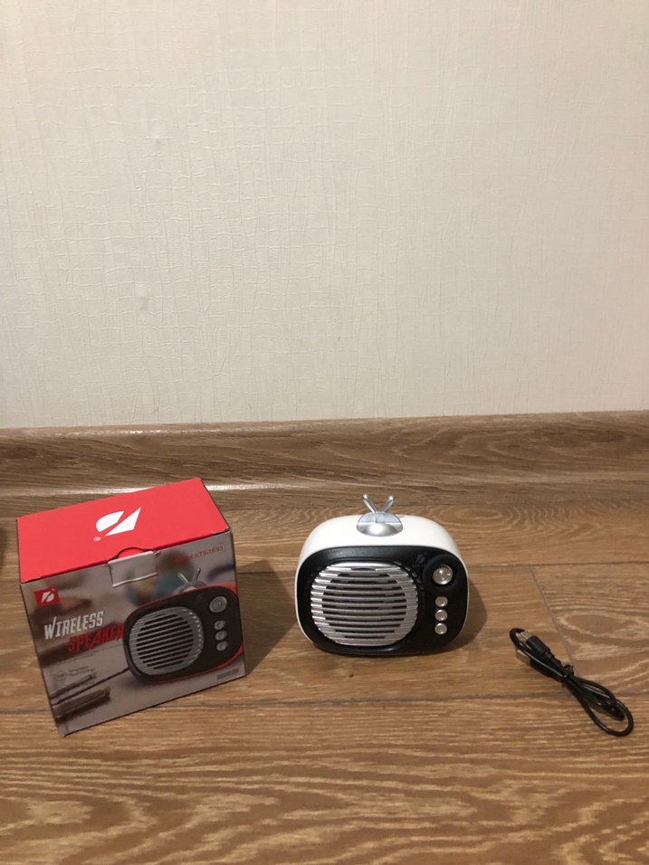 Renkli ışıklara sahip beyaz kablosuz müzik sistemi, USB şarj kablosu ile birlikte gelir. Kutuda "WTRELES" yazısı yer almaktadır.