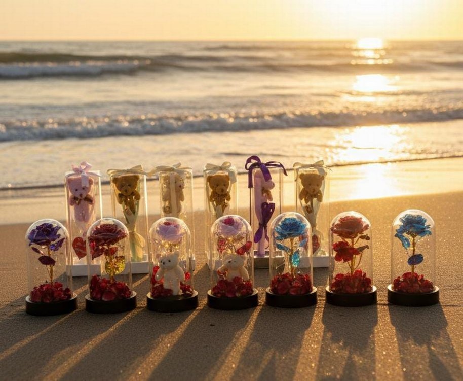 Renkli Işıklı Cam Fanus İçinde Gül Dekorasyonu
