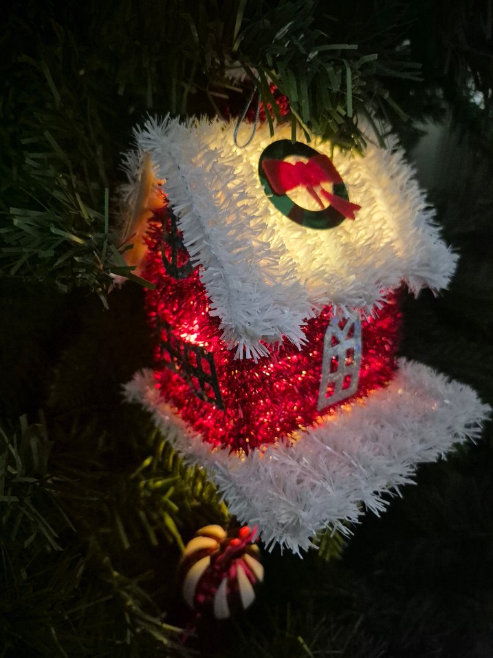 Beyaz süslemeli ve çatısında çelenk bulunan, iç aydınlatmalı kırmızı renkli renkli yılbaşı ev süsü. 15 cm yükseklikte 10 cm eninde,piller dahil kullanıma hazır şekilde gönderilecektir. #yılbaşı #ağaçsüsü #kırmızıev #ışıklıev #ağaçevi