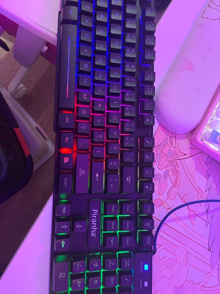Piranha marka, çok renkli ışıklı ve koyu renk tuşlara sahip mekanik klavye. Canlı ışık efekti ile yazma ve oyun deneyimi sunar.