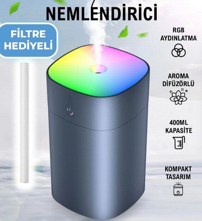 400 ml kapasiteli, renkli ışıklı nemlendirici. Aroma difüzörlü, rahat tasarımlı ve RGB aydınlatmalı.