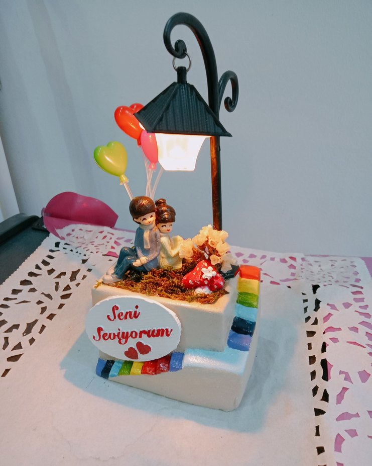 Renkli figürin, kalp şeklinde balonlar tutan çift ve "Seni Seviyorum" yazısıyla romantik bir sahne oluşturuyor. Lambası ile yüksekliği Birlikte yüksekliği 20cm, uzunluğu 15cm, eni 10cm,