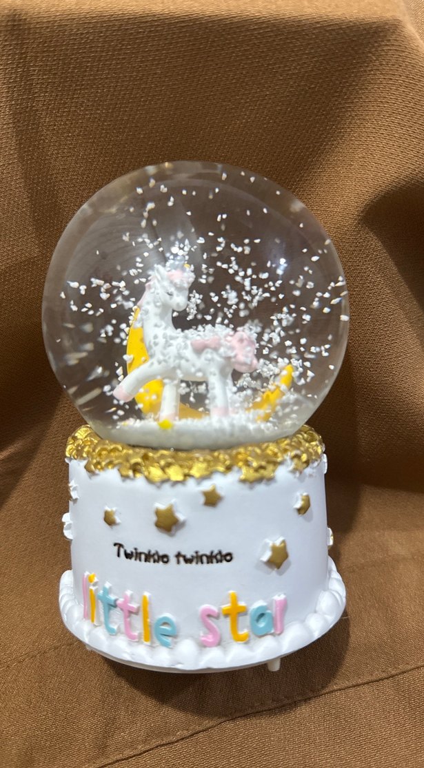 Renkli harfler ve yıldızlarla süslenmiş, içinde beyaz unicorn figürü bulunan kar küresi. Üzerinde 'Twinkle twinkle' yazısı var. ❄️ çok kaliteli ve sıfır üründür müzikli ve ışıklıdır kutusuyla gönderim yapılacaktır. Gece lambası hediyedir.