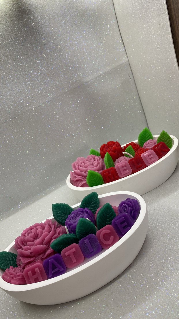 Beyaz oval tutucularda renkli çiçek ve harf şeklinde dekoratif mumlar. Her sette canlı pembe, mor, kırmızı ve yeşil tonlarla isim yazıyor. ️