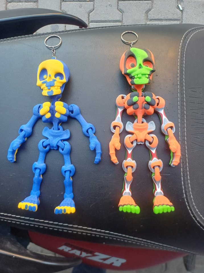 Mavi-sarı ve turuncu-yeşil renklerde, hareketli eklemleri olan esnek iskelet anahtarlıklar. Dekorasyon veya oyuncak olarak kullanılabilir.