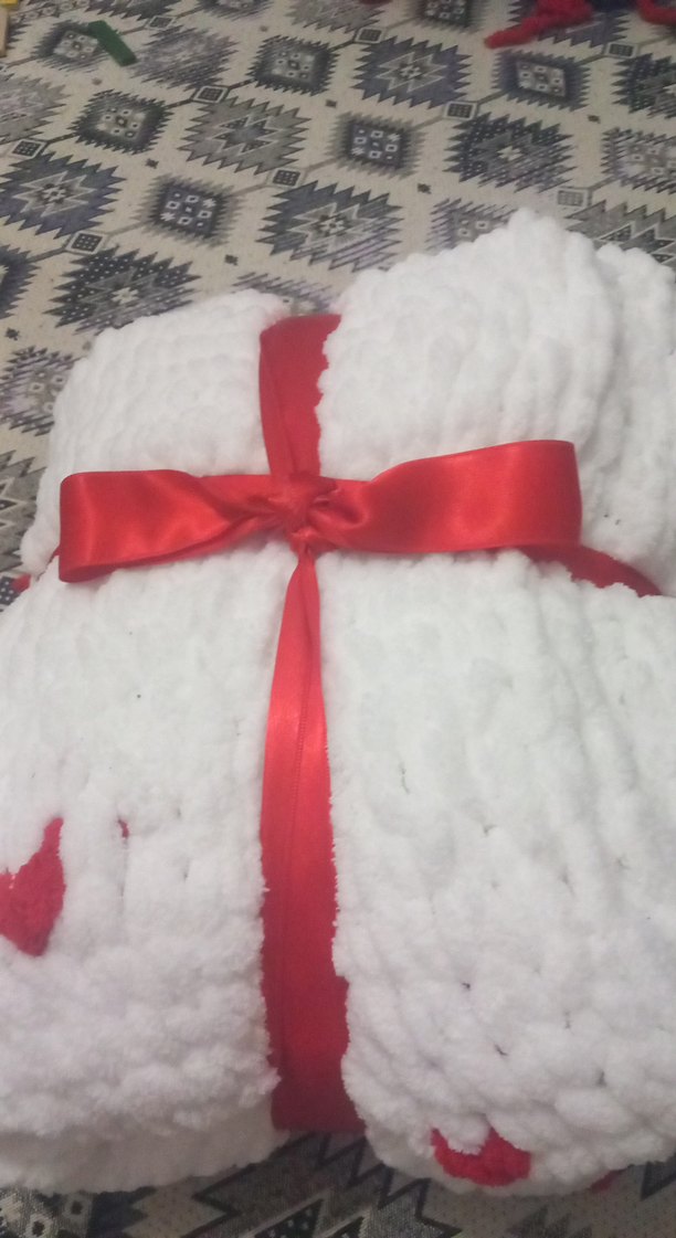 Yumuşak örgüden yapılmış, renkli işlemeli beyaz çocuk battaniyesi, kırmızı kurdeleyle bağlanmış. Hem rahat hem dekoratif.