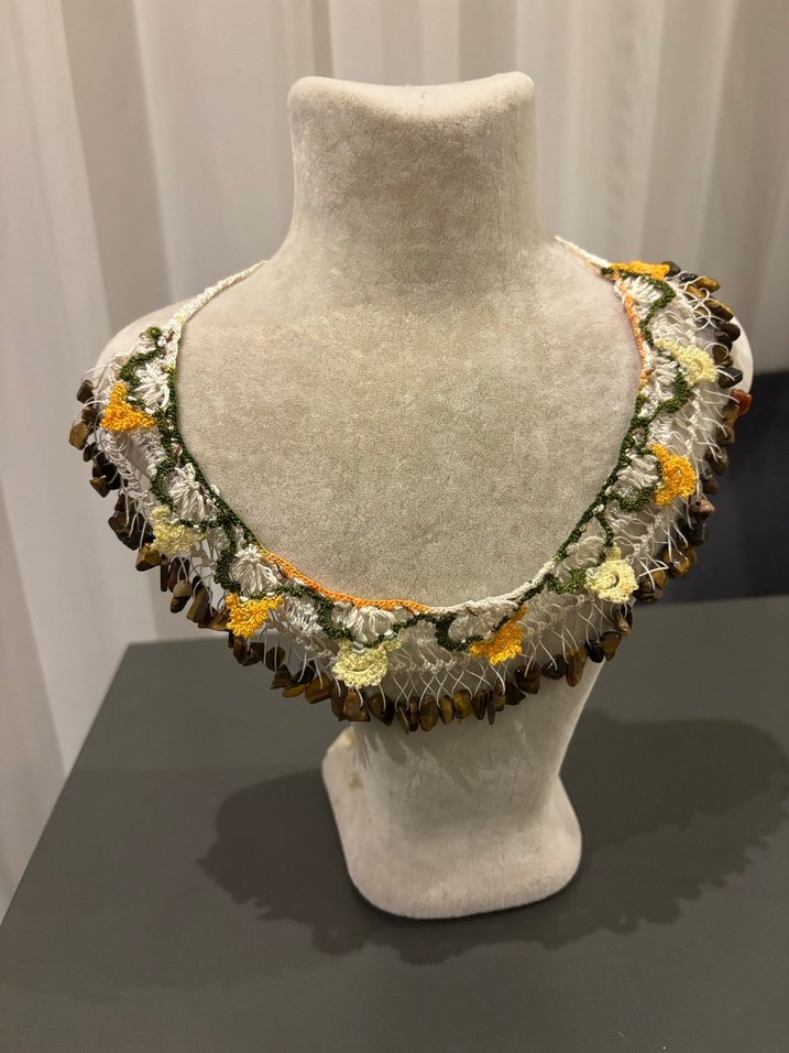 Bu kısa boy kolye, renkli işlemeli desenler ve boncuk detaylarıyla bohem tarzını yansıtıyor. Günlük kullanım için uygun, retro ve hippie havasında. İğne oyası, boncuk ve doğal taş ile tasarlanmıştır. El yapımıdır. Bir kadın girişimciye destek için satıyorum.