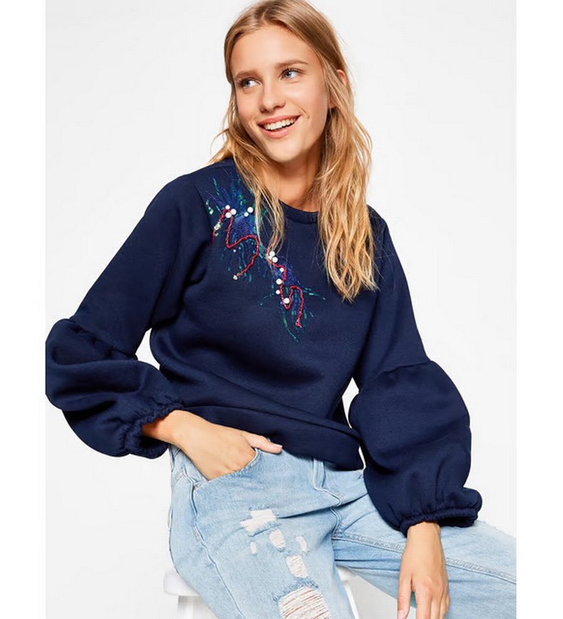 Oversize kesim, uzun kollu denim sweatshirt. Renkli işlemeli ve boncuk detaylarıyla günlük sokak stiline uygun.