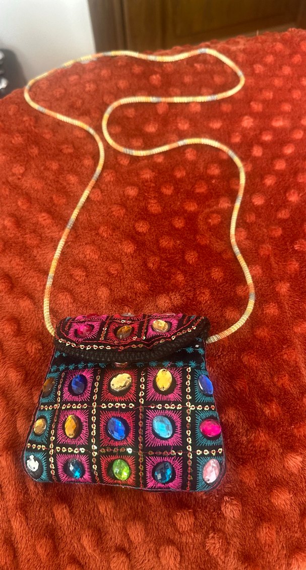Renkli işlemeli ve boncuklu detaylara sahip tekstil bohem çanta, uzun askılıdır. Fotoğrafta görüldüğü gibi çıt çıt kısmında çok az kusur var