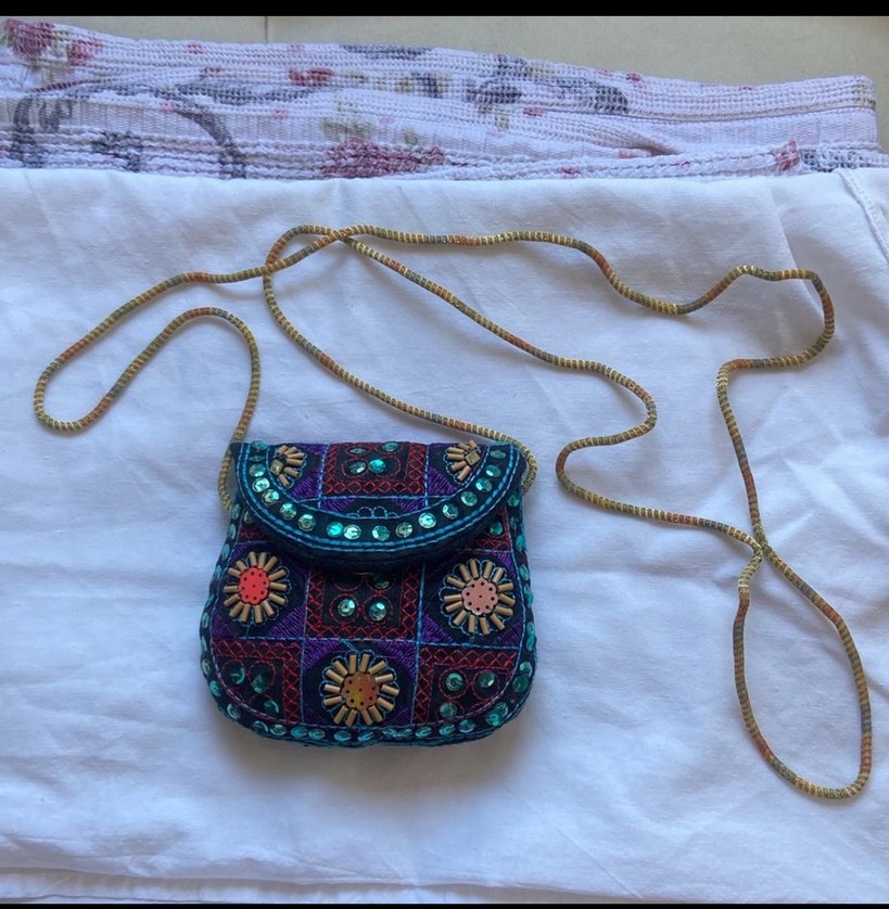 Renkli işlemeli tekstil ve boncuk detaylı, uzun askılı bohem tarzda kadın çapraz çanta, günlük kullanım için uygundur.