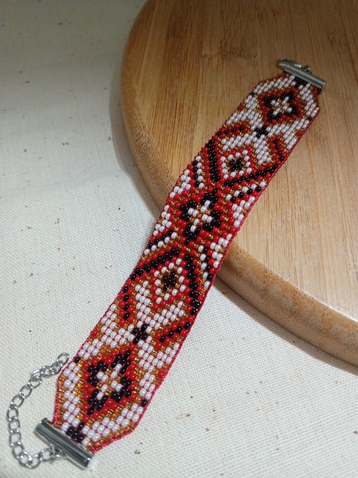Renkli işlemeli boncuklarla süslenmiş,etnik desenli bohem tarzda kadın bileklik. Günlük kullanıma uygun geleneksel tasarım sunar.Ayarlanabilir zincir kullanılmıştır.