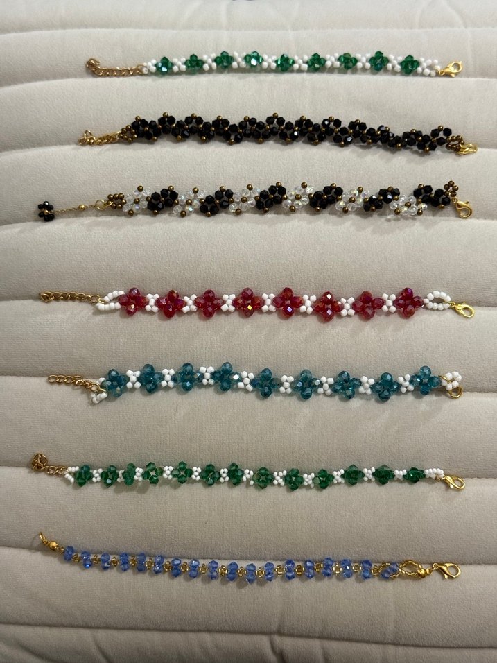 Renkli boncuklarla işlenmiş çiçek desenli, altın renk kapamalı bileklikler. Minimalist tarzda, günlük kullanıma uygun.