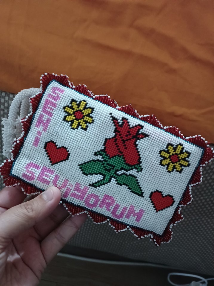 Çiçek ve kalp desenleriyle renkli işleme ve boncuk detaylı kadın cüzdan markası yok el işçiliği