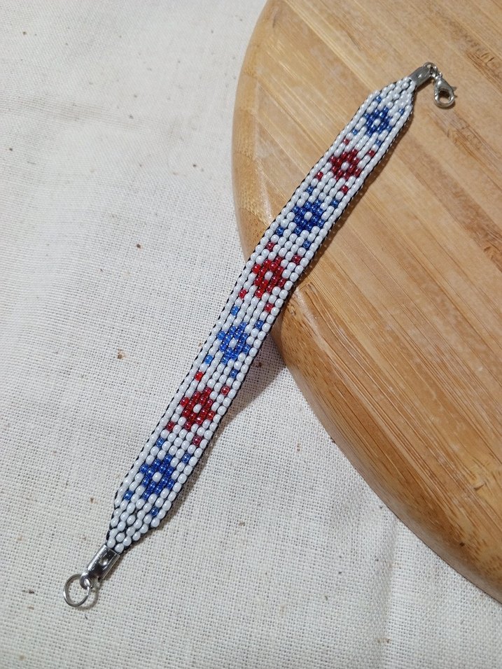 Çok renkli boncuklarla işlenmiş kilim desenli bileklik, bohem ve retro tarzını yansıtır. Günlük kullanıma uygundur.