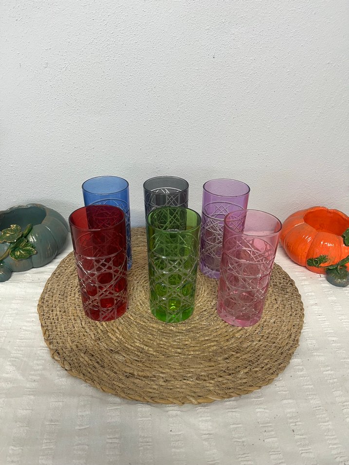 İşlemeli desenlere sahip, açık tonlarda mavi, gri, mor, kırmızı, yeşil ve pembe renklerde renkli cam bardak seti. Çifti 300 tl renk seçebilirsiniz