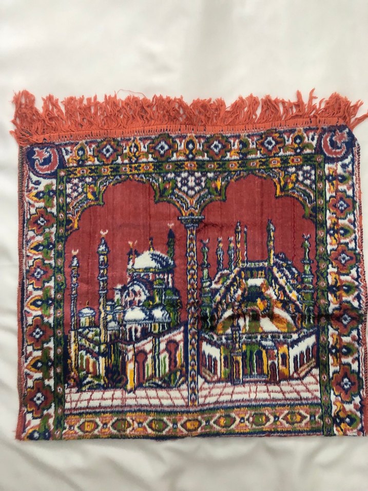 Canlı renklerde işlemeli geleneksel desenlere sahip renkli halı seccade