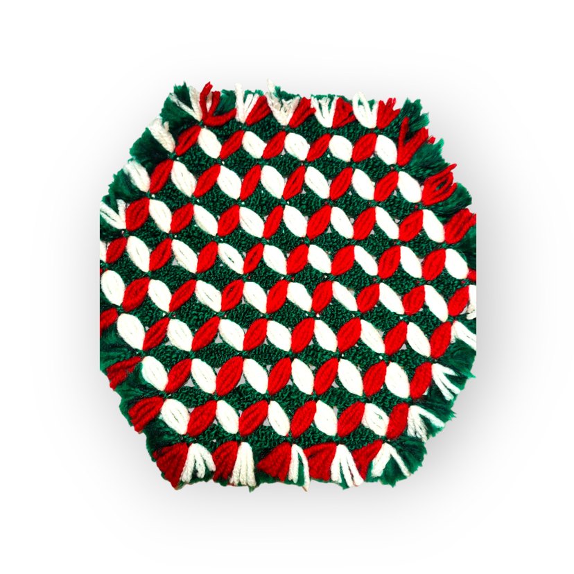 Kırmızı, yeşil ve beyaz renklerin canlı karışımıyla işlenmiş geleneksel tarzda renkli bir lif banyo lifi