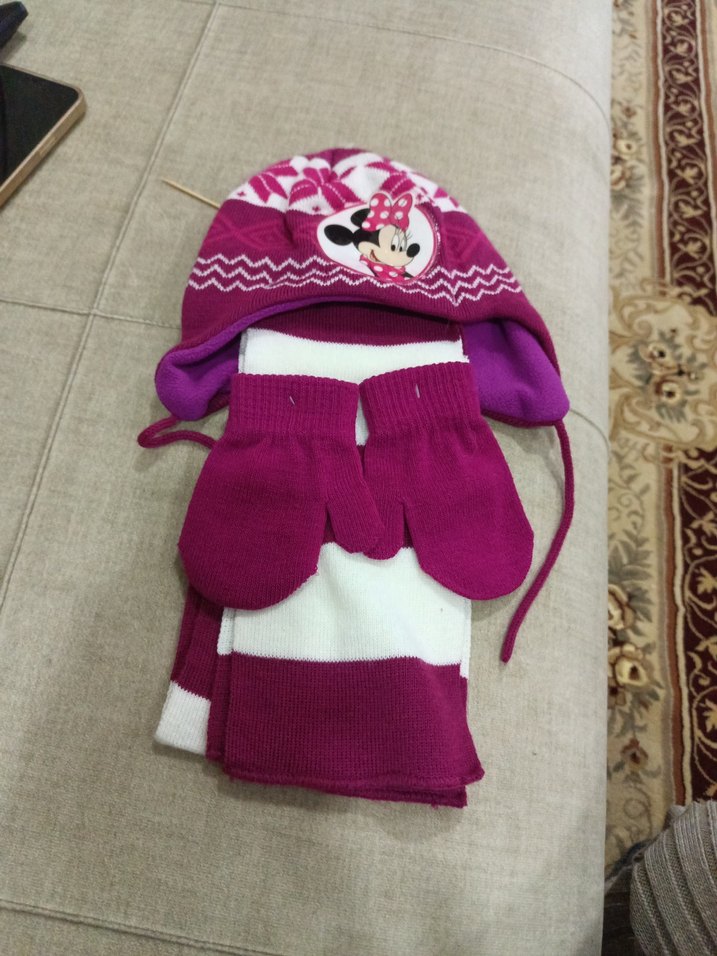 Renkli örme kumaştan yapılmış, işlemeli pembe bere, eldiven ve atkı seti, trend sokak tarzı için uygun.