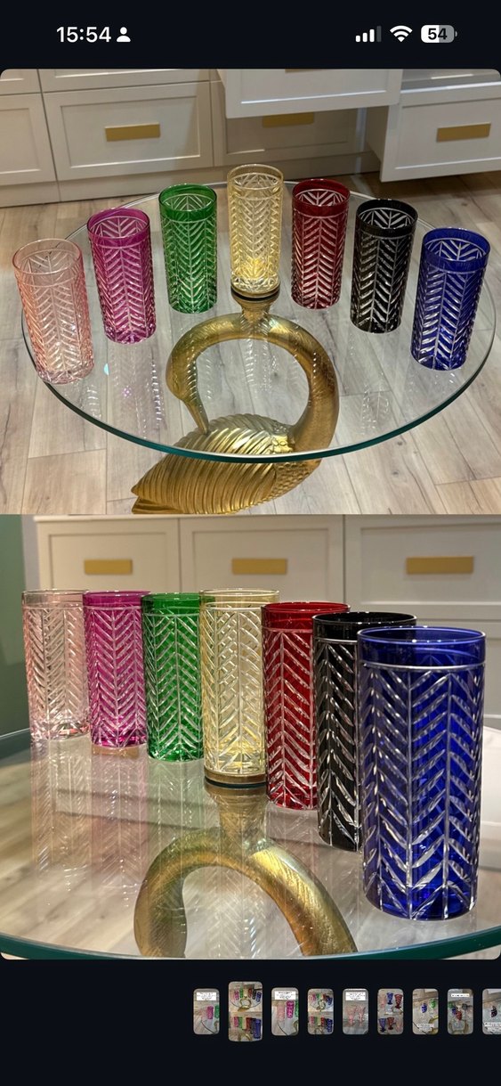 Farklı koyu renklerde, işlemeli desenli uzun bardaklardan oluşan set. Renkleri pembe, yeşil, sarı, kırmızı, siyah ve mavi içerir.