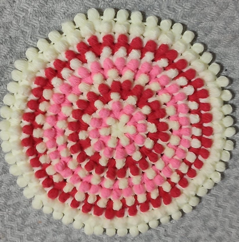 Kırmızı, pembe ve krem tonlarında işlemeli desenlere sahip renkli yuvarlak banyo lifYumuşak ve dekoratif.