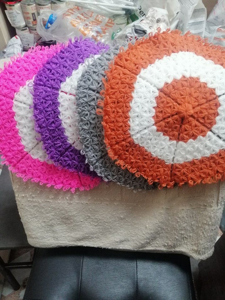 Pembe, mor, gri ve turuncu tonlarında işlemeli renkli yuvarlak el emeği lif modelleri dairesel desen ve dokulu işlemeye sahip. ️tekli satış gşyatı