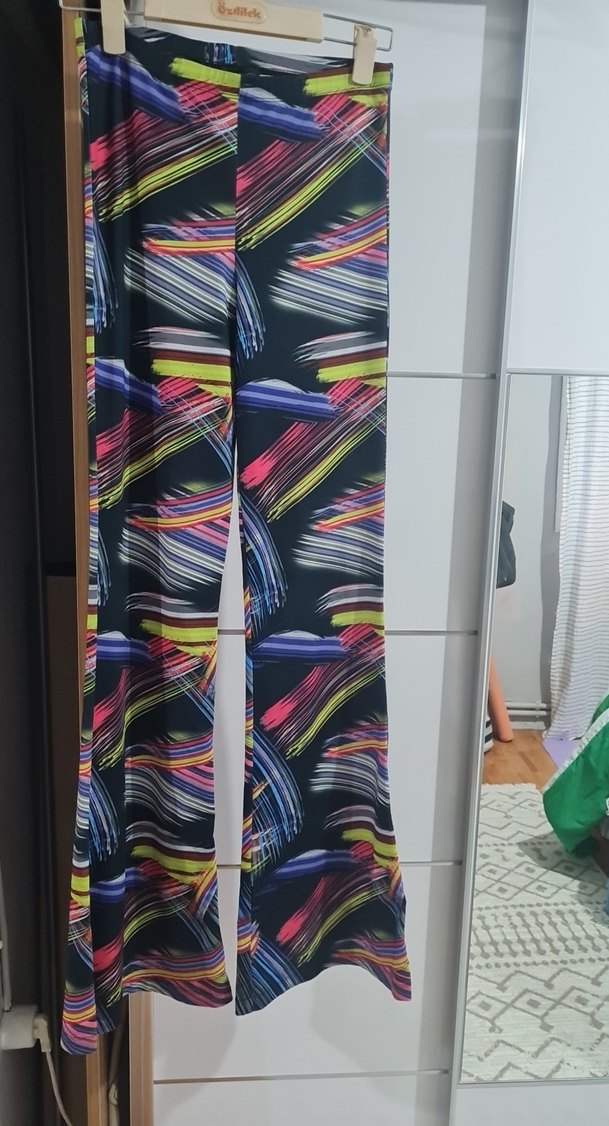 spor kumaş İspanyol kesim spor tayt Uzun, bol kesim kadın pantolonları, canlı batik desenli ve pilili detaylara sahip, sentetik kumaştan yapılmıştır.