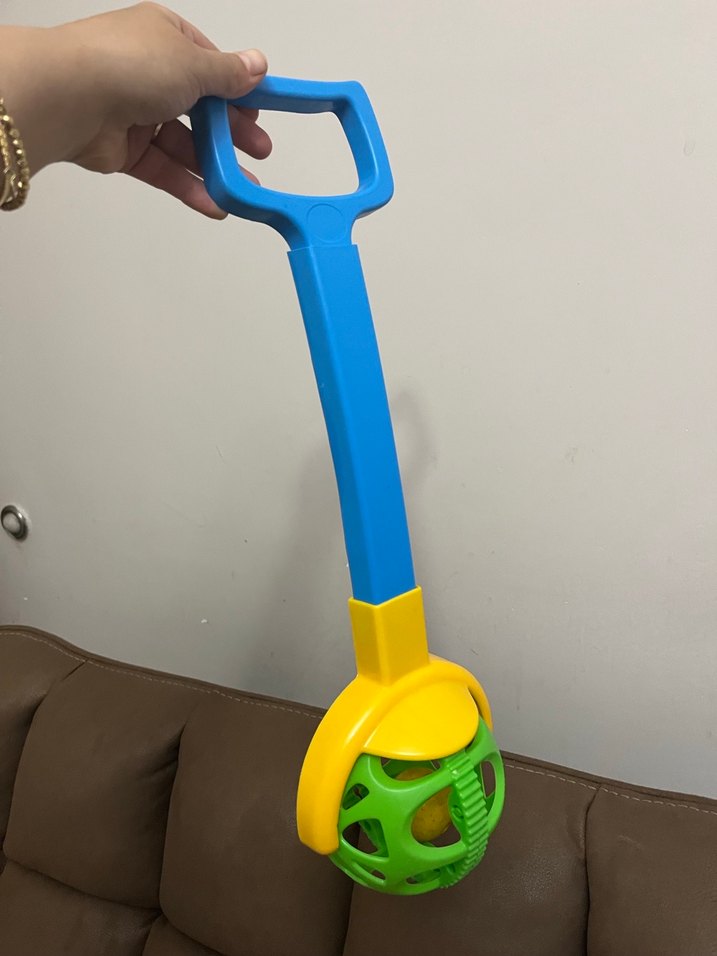 Uzun mavi saplı, sarı ve yeşil top detaylı renkli itmeli çekmeli oyuncak, çocukların oyun oynaması için uygun. kusuru yoktur.