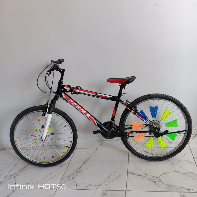 Bu bisiklet, jantlarda renkli süslemelerle canlı bir görünüm sunar. Siyah ve kırmızı dayanıklı gövdeye sahiptir, oturma yüksekliği ayarlanabilir.