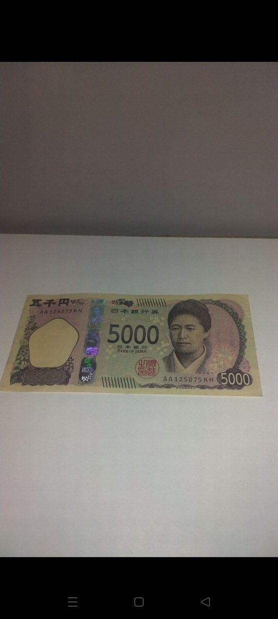 Renkli Japon 5000 yen hediye banknotu, üzerinde AA125075KH seri numarası bulunur. Canlı ve dikkat çekici bir koleksiyon ürünü.