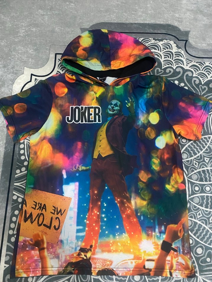 Renkli, kısa kollu ve kapüşonlu ünisex’s çocuk tişörtü, bol kesim ve yuvarlak yaka ile sentetik kumaştan üretilmiştir. Joker baskısı ve "JOKER" yazısı bulunur. Herhangi bir deformasyonu yoktur yeni gibi
