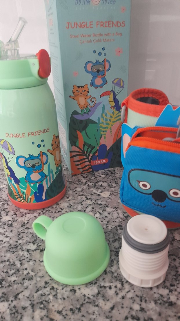 550 ml kapasiteli renkli çelik su şişesi, Jungle Friends temalıdır. Güvenli kapak ve pipet içerir, çocuklar için uygundur. herhangi bir sorunu yok akıtma yapiyormu diye kontrol ettim sadece hediye geldi bizde benzeri war. Hem suluk hem termos iki ayrı başlık şeklinde