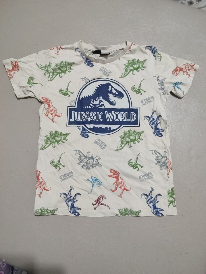 Kısa kollu, bisiklet yaka, renkli dinozor baskılı ve Jurassic World logosu olan dar kesim erkek tişörtü.
