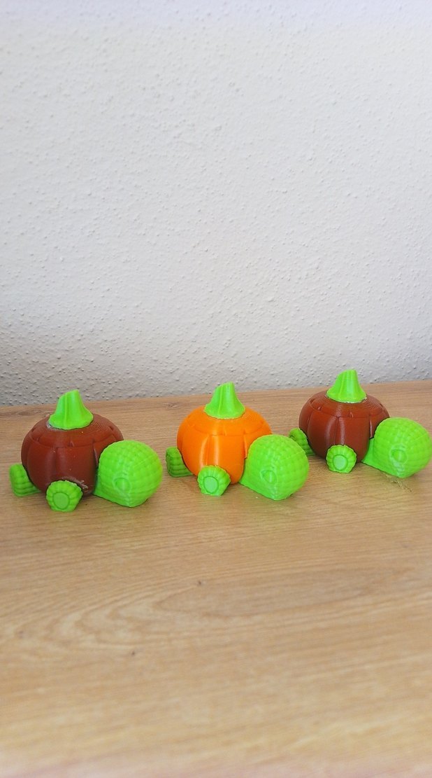 Turuncu ve kahverengi kabak şeklinde gövdelere sahip, parlak yeşil başlı ve bacaklı renkli oyuncak kaplumbağalar.