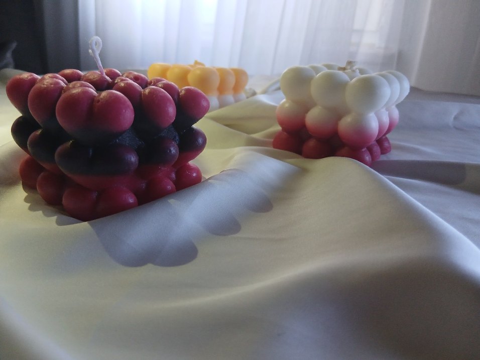 Beyaz, pembe ve sarı tonlarda renkli kabarcık şekilli mum seti, dekoratif bir görünüm sunar. ️