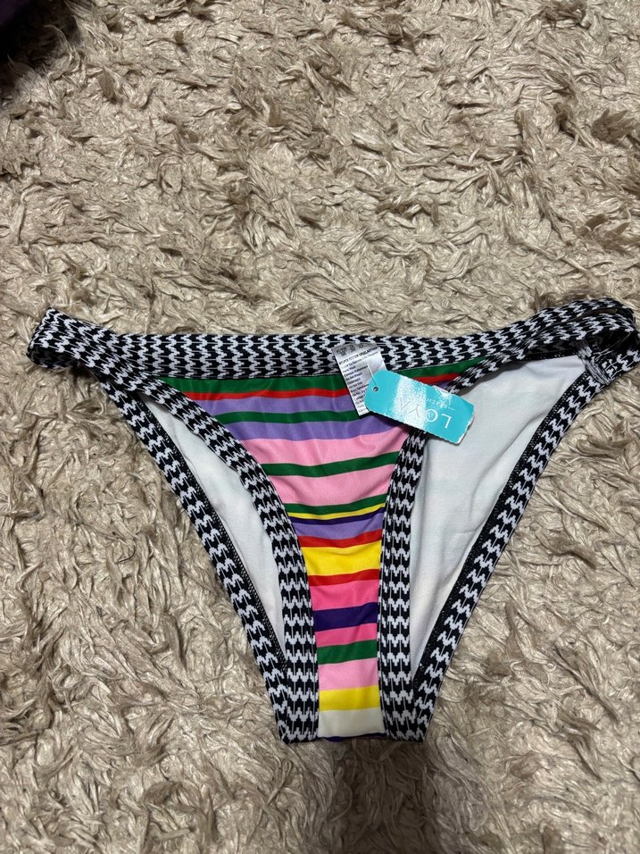 Renkli çizgiler ve siyah-beyaz zikzak desenli elastik kenarları olan, vücuda oturan kadın bikini altı. Sıfır ürün etiketli sorunsuz 36/38 beden için uygun loya marka