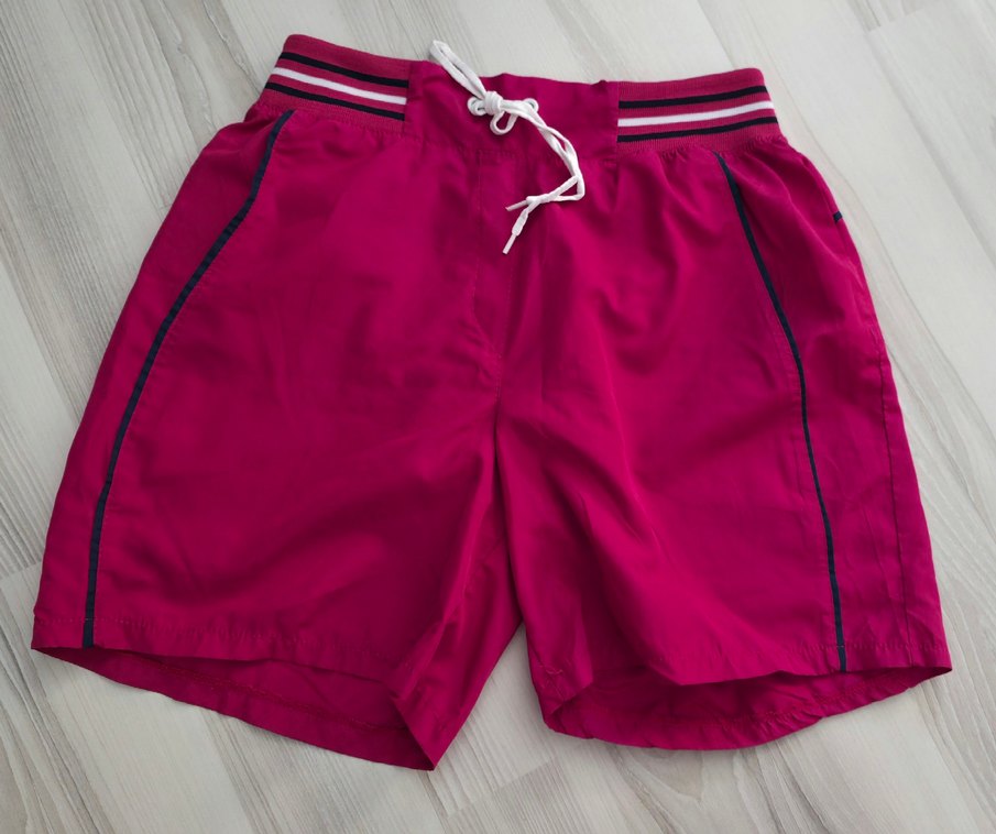 Canlı pembe renkte, çizgili bel bandıyla rahat kesim deniz şortu.
