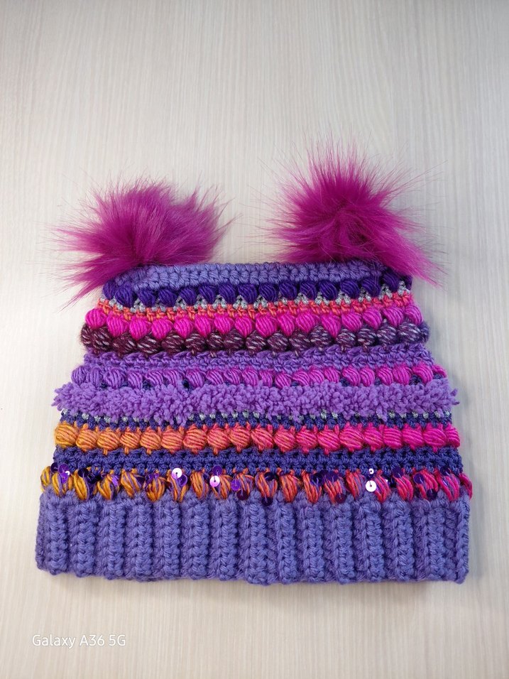 Renkli şeritler ve iki tüylü ponponlu, örgü mor kadın bere, rahat ve bohem tarz sunar.