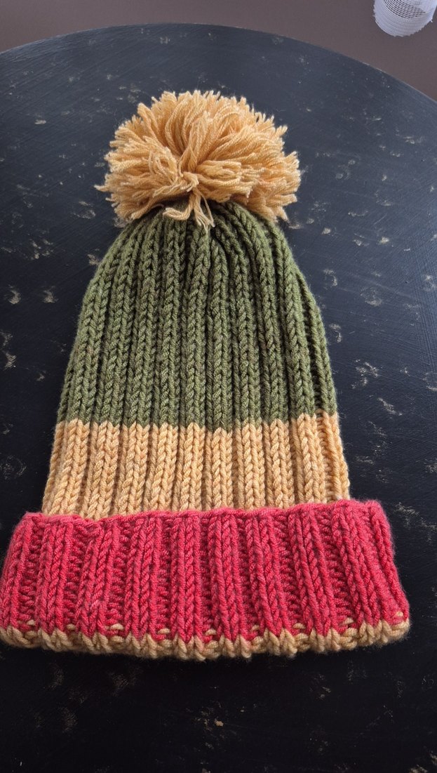Renkli örgü yapısıyla, üstte ponpon bulunan kadın bere. Yeşil, bej ve kırmızı tonlarıyla bohem ve retro tarzda, rahat bir bere.