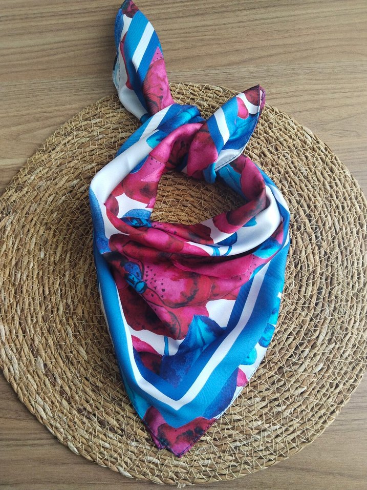 Renkli çiçek desenli, yumuşak kumaştan yapılmış, kadın fular. Şık bir tarz oluşturur.
