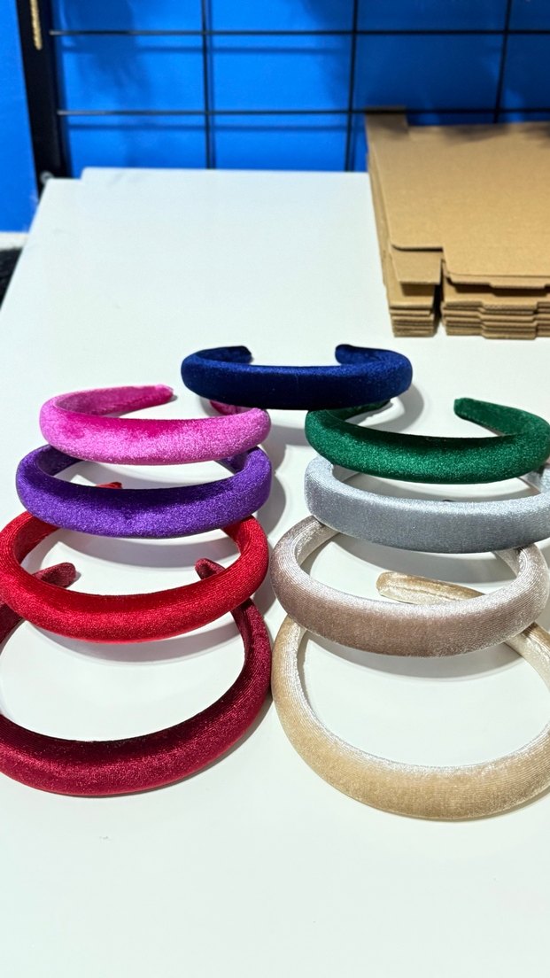 Çok renkli sentetik kumaştan, elastik ve kadife dokulu kadın saç taçları. Bohem ve retro tarzlara uygun, konforlu kullanım sağlar.