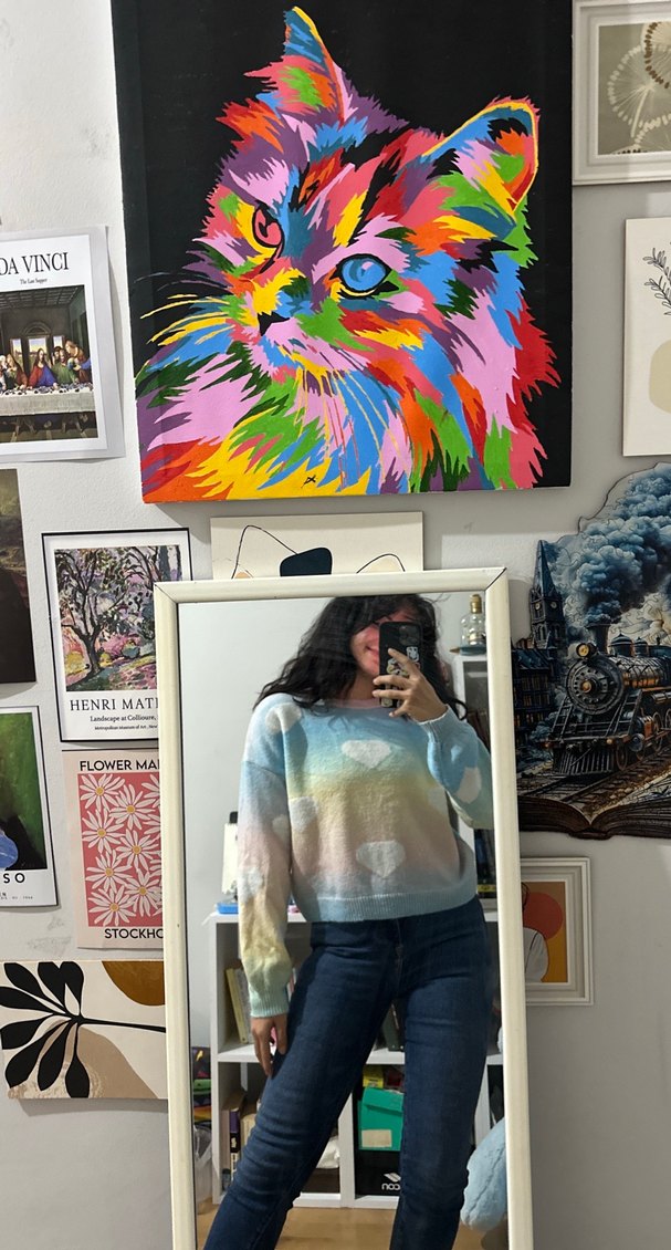 Kadınlar için uzun kollu, bol kesim, pastel renkli tie-dye desenli, denim görünümlü kazak. Crew yaka ve rahat sokak stiline uygun. Defo yok 5-6 defa giymişimdir
