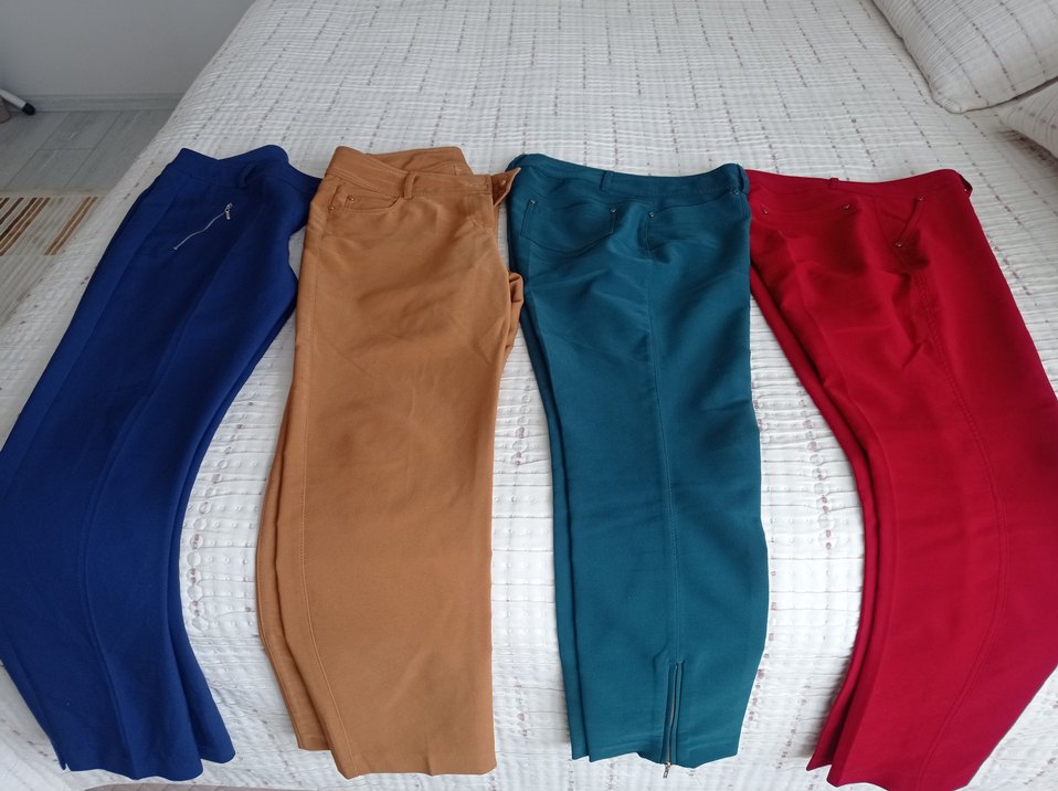 Çok renkli, fermuarlı, normal boy, vücuda oturan kadın kumaş pantolonları. Günlük şıklık için uygundur. hepsi birden 1000 TL dir