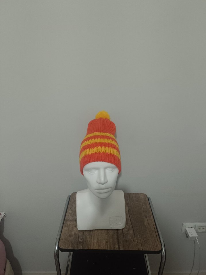 Renkli ve sıcak tonlarda çizgili, örgü dokulu kadın bere. Bohem ve retro tarzlara uygundur.